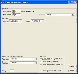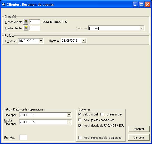 Luego, seleccionamos al cliente, los filtros necesarios y presionamos Aceptar