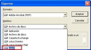 En formato, seleccionamos “Adobe Acrobat (PDF)” y en destino, seleccionamos la opción “MAPI”