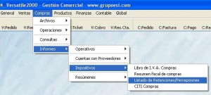 Para llevar a cabo esta acción, se debe, en el sistema, ir a Compras – Informes – Impositivos – Listado de Retenciones/Percepciones.