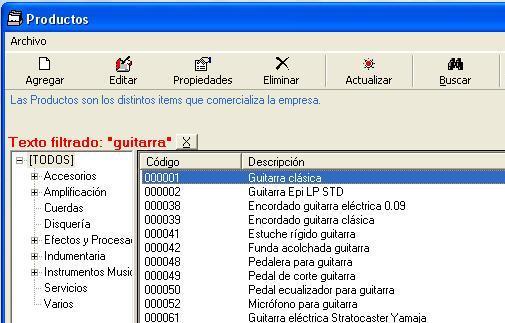 Presionando la tecla F4 es posible filtrar entre todos los registros por una porción de texto. Por ejemplo, podemos filtrar todos los artículos que incluyan la palabra «guitarra» en su descripción.