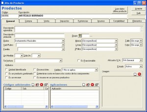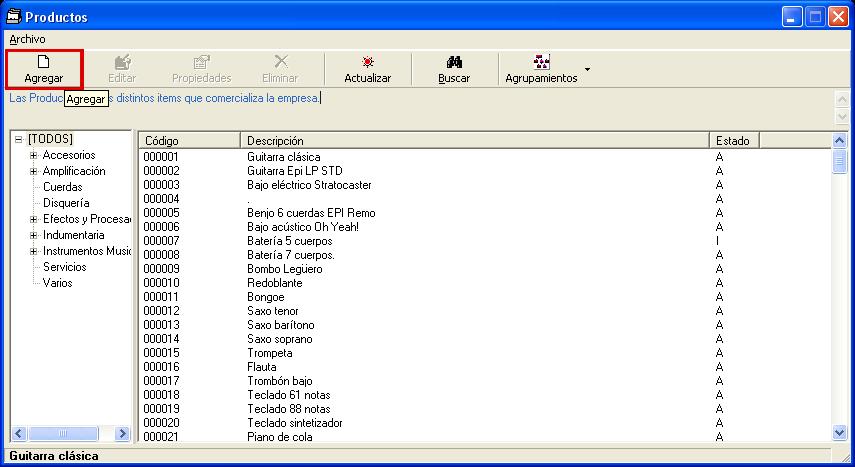 Si quisiéramos, por ejemplo, eliminar el producto 000001 llamado Guitarra clásica, deberíamos crear un nuevo producto, para eso es necesario presionar “Agregar”.