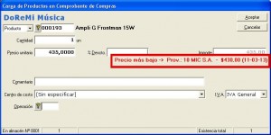 Le presenta una alerta en la que se indica el proveedor, el precio y la fecha a la que está actualizado el precio en cuestión.  Puede ver un video que lo explica con detalle aquí.