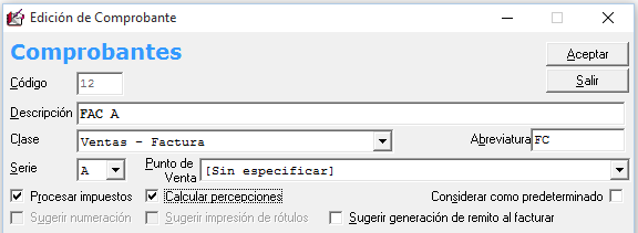 Como último paso, nos dirigimos a General > Tablas de la Empresa > Comprobantes y, en las Facturas, tildamos la opción «Calcular percepciones» para que se realicen de forma automatizada.