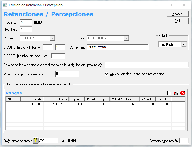 Es necesario indicar el número de impuesto (la tabla completa aquí), el proceso al que corresponde, si es retención o percepción y la referencia contable a la que se imputará.