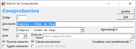 Luego, vamos a General > Tablas de la Empresa > Comprobantes y, en la Orden de Pago, tildamos la opción «Calcular percepciones». Dependerá de la configuración particular del sistema si se realizan de modo automático o presionando el botón «Calcular Retención» en la orden de pago.