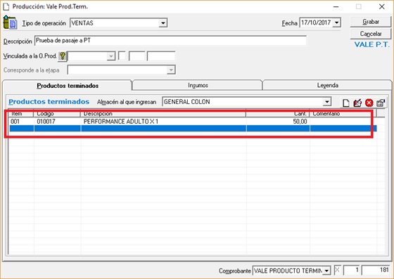 Luego al cargar en vale de producto terminado en Productos – Producción – Vale de Producto Terminado,, indicamos la cantidad de productos producidos y nos mostrará en la solapa de insumos, la cantidad de ellos consumidos, los cuales, se darán de baja del stock,
