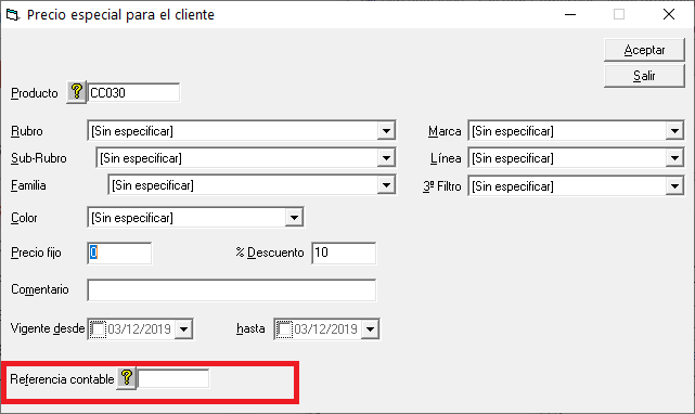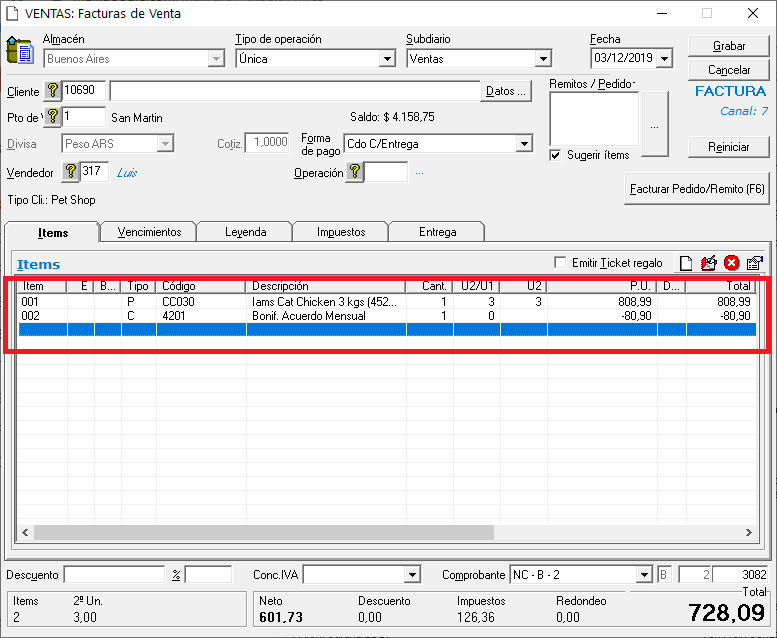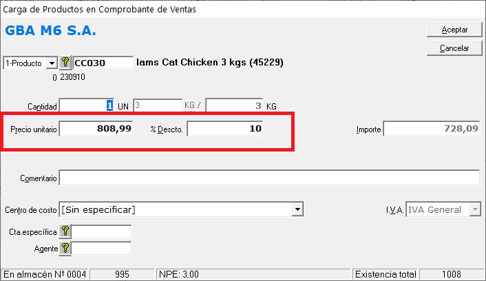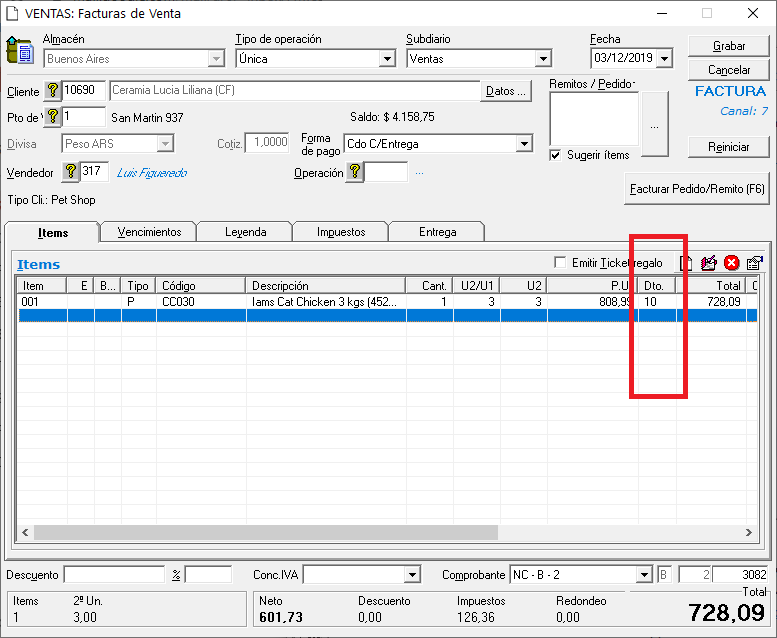Por otro lado, cuando no ponemos nada en la referencia contable como vemos en la foto, el sistema lo cargará ese descuento en la linea del item. También es posible (mediante configuración interna) que no se vea reflejado ese descuento, y el precio ya lo traiga con el descuento restado.