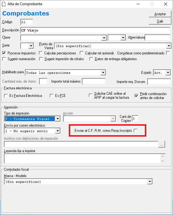 En el caso especial de las impresiones por controlador fiscal, si tienen equipos que no soporten esta actualización en la facturación, la AFIP indica que deberá indicar que se factura como Responsable Inscripto. Se realizó una reforma en el sistema de facturación, la cual se carga en la definición del comprobante, para que se envíe en los casos que sean Monotribustistas los clientes, el tipo Responsable Inscripto directamente en forma transparente. Esta reforma se realizó de esta manura, para que los clientes quedan igual que ahora cargados en el sistema, y de esta forma, en los informes fiscales quedan catalogados como realmente son sus categorías.