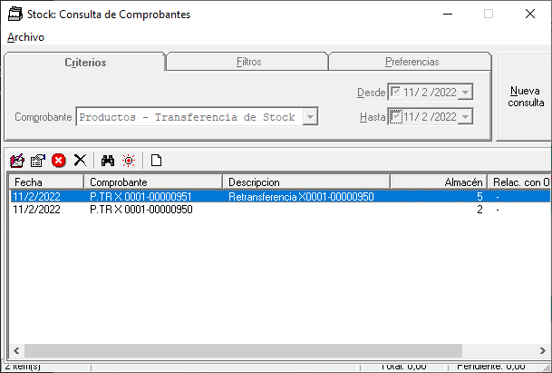 En la consulta de comprobantes de stock, se puede ver el comprobante 950, el de transferencia, y el 951, el de retransferencia.