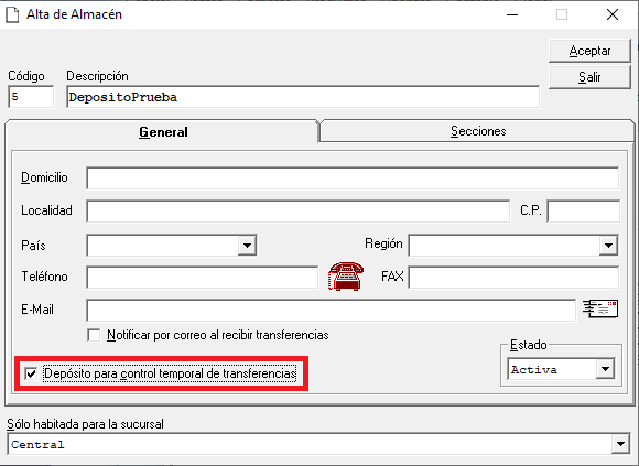 Se completa la información y, si se desea utilizar ese depósito para control temporal de transferencias, se selecciona la opción remarcada en rojo.
