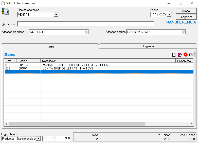 En la columna “Almacen” muestra el almacen de origen. En el caso de el comprobante 950, el almacen de origen es GASCON(2), y el del 951, es DepositoPrueba(5).