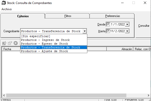 Para consultar los comprobantes de stock se accede a (Productos- Consultas- Comprobantes de Stock).
