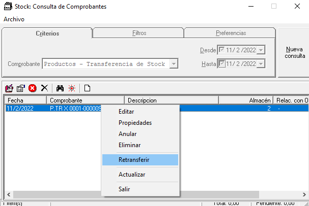 Para ello, se hace clic derecho en el comprobante y se selecciona la opción Retransferir.