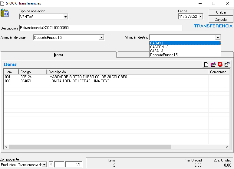 En la descripción, tendrá el texto “Retransferencia…” seguido del número de comprobante al que se hizo la transferencia original. El almacén de origen será DepositoPrueba y el almacén destino será el que elija el usuario.