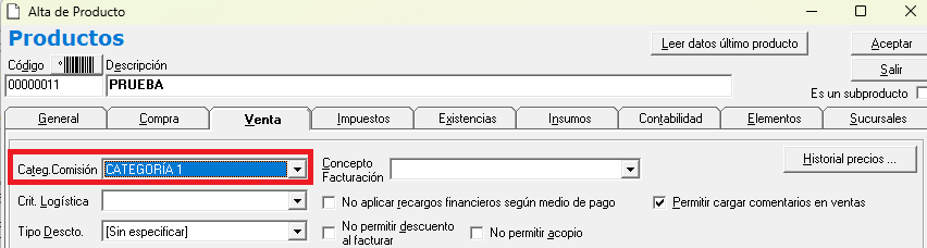• Ruta: Ventas > Archivos > Categorías de Comisiones.