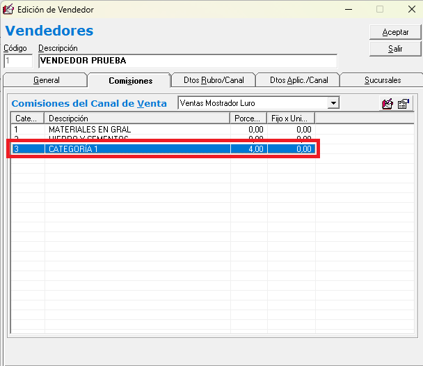 • Procedimiento: Ingrese a la ficha del vendedor y, en la solapa Comisiones, asigne el porcentaje de ganancia para cada categoría de producto.