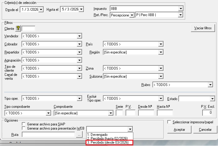 En la sección de ventas el procedimiento continúa siendo el mismo. La única modificación se encuentra en el formato de presentación que se realiza a fin de mes, donde deberán seleccionar la opción “3 – Percibido (desde 03/2026)”.
